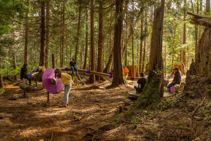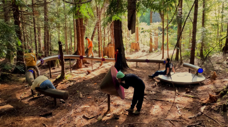 Forest Mixer was developed with careful consideration for the surrounding ecosystem. The project was informed by close collaboration with a landscape architect deeply knowledgeable about the site and the region, including seasonal changes and species at risk. The site itself had been undergoing rewilding for two years, providing valuable insight into what was possible and what was necessary to preserve the health of the forest. To minimize intervention, the structure is elevated on legs with small, targeted foundations, allowing water, plants, and wildlife to continue circulating beneath and around the artwork.