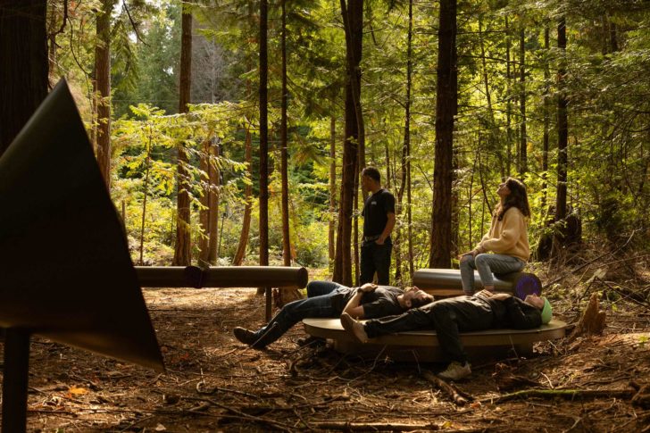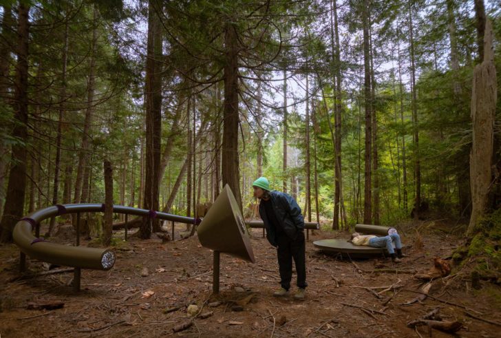 From the site, the calls of tree frogs and sea lions blend with the forest’s own acoustic presence, creating a rich sonic habitat for the artwork.